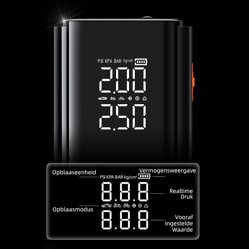 • Kristalheldere dubbele schermen (PSI/KPA auto-switch)