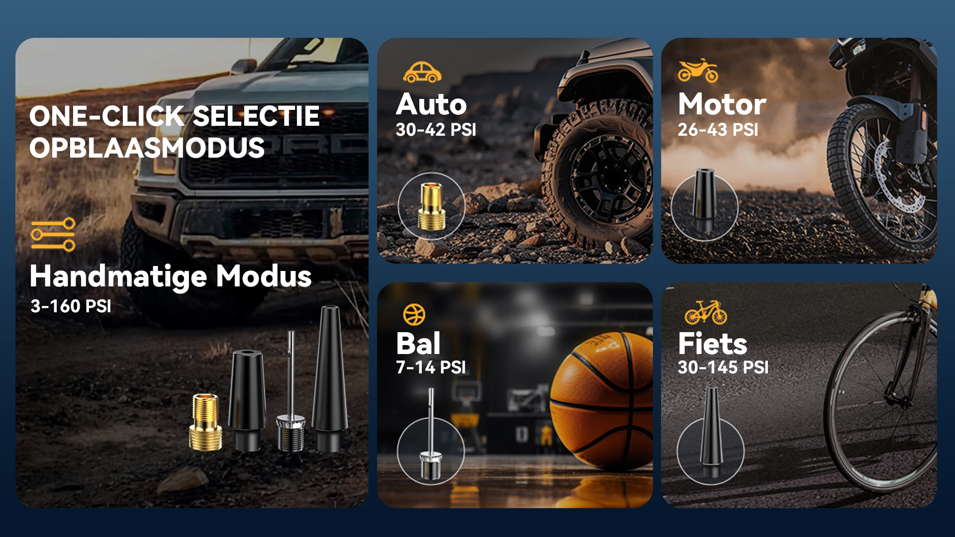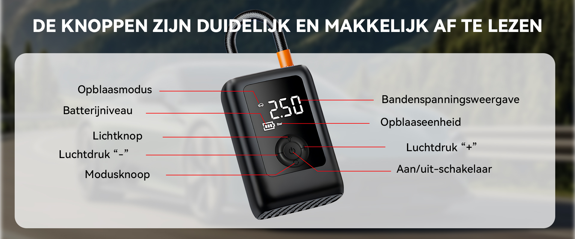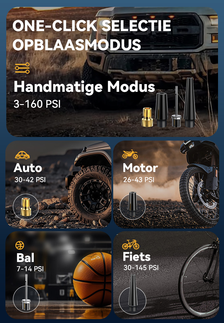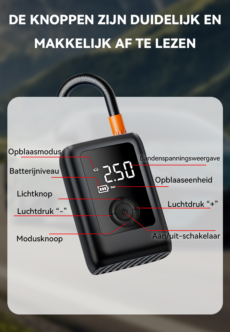 Stel de gewenste bandendruk in en start met één knop. Het apparaat stopt precies bij het bereiken van de ingestelde druk en voorkomt zo overvullen – voor meer veiligheid en comfort.