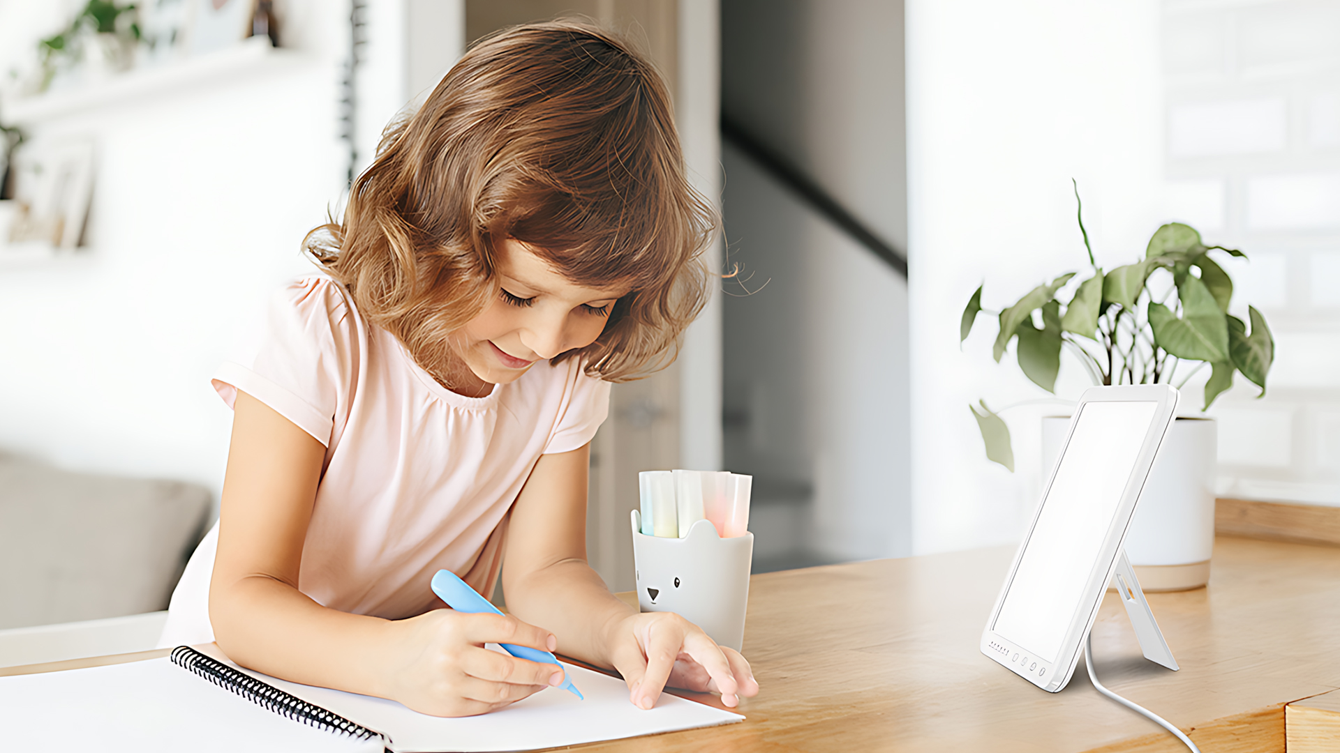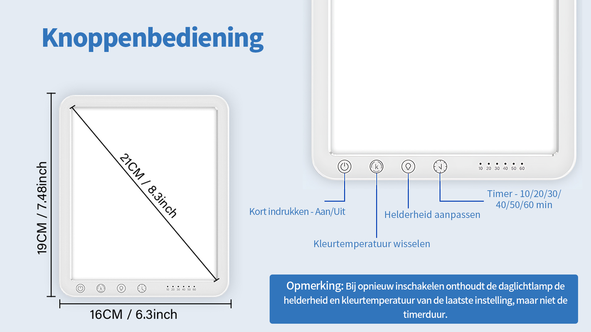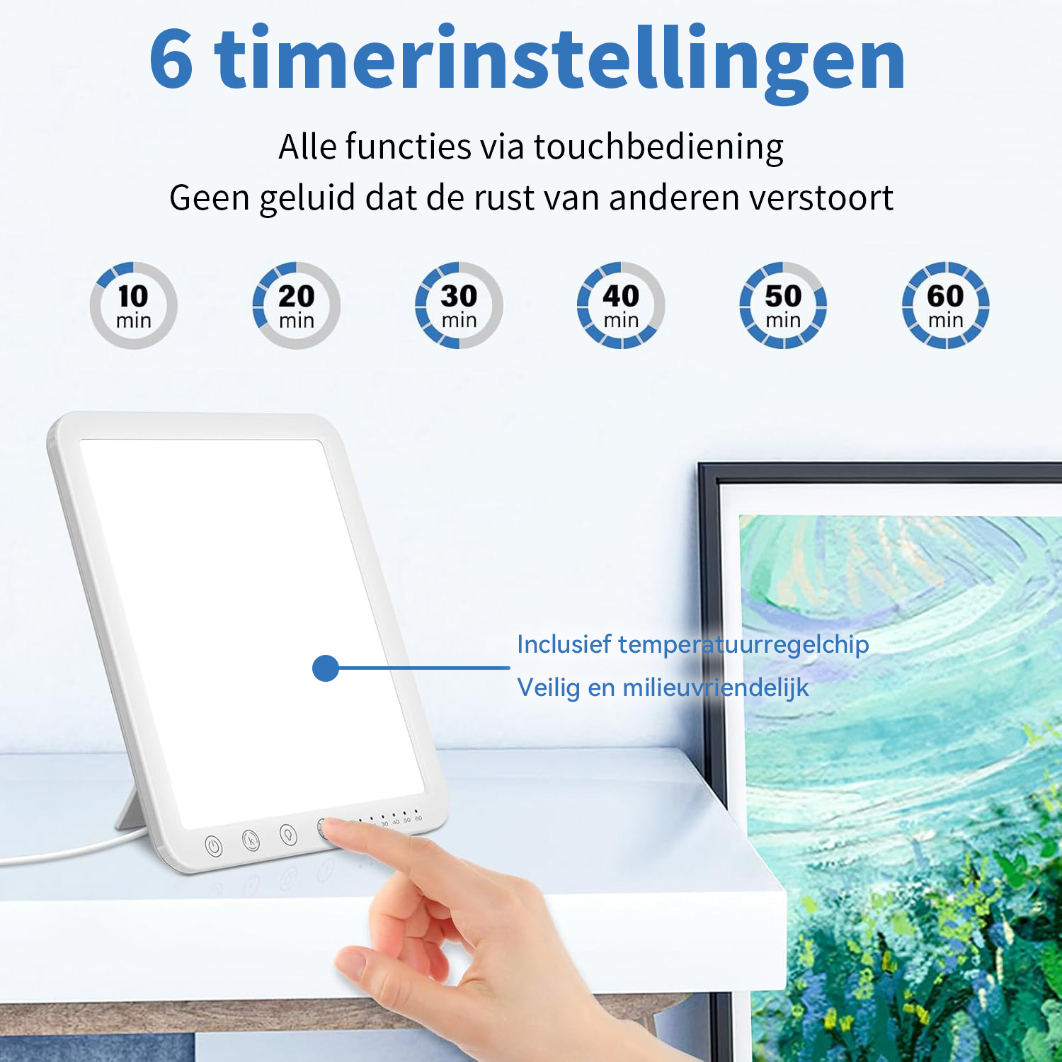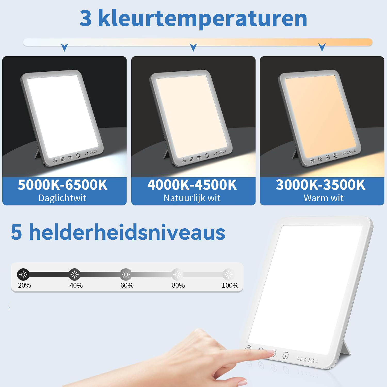 Onze daglichtlamp biedt 3 kleurtemperaturen: Warm licht (3000K), Neutraal licht (4000K) en Koel licht (6500K). Met een eenvoudige aanraking wissel je tussen de lichtkleuren. Of je nu warm, behaaglijk licht zoekt om te ontspannen of helder, koel licht voor gefocust werken, je stelt de meest geschikte lichtsfeer in op basis van afstand, omgeving en lichtgevoeligheid.