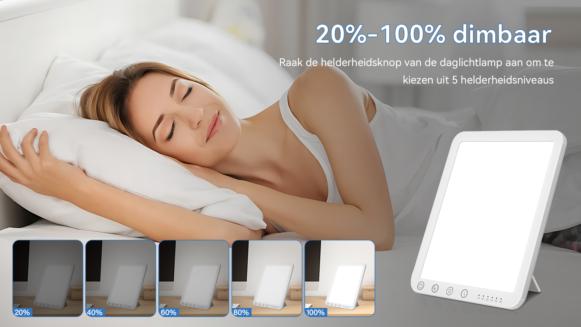 Onze daglichtlamp biedt 5 helderheidsniveaus (20%–100%) voor maximaal comfort en persoonlijke afstemming zonder de ogen te belasten. De lamp is uitgerust met een luchtgekoelde chip die de temperatuur onder 36°C houdt, ongeacht de gebruiksduur. Dit verlengt de levensduur van de lamp en zorgt voor veilig gebruik.