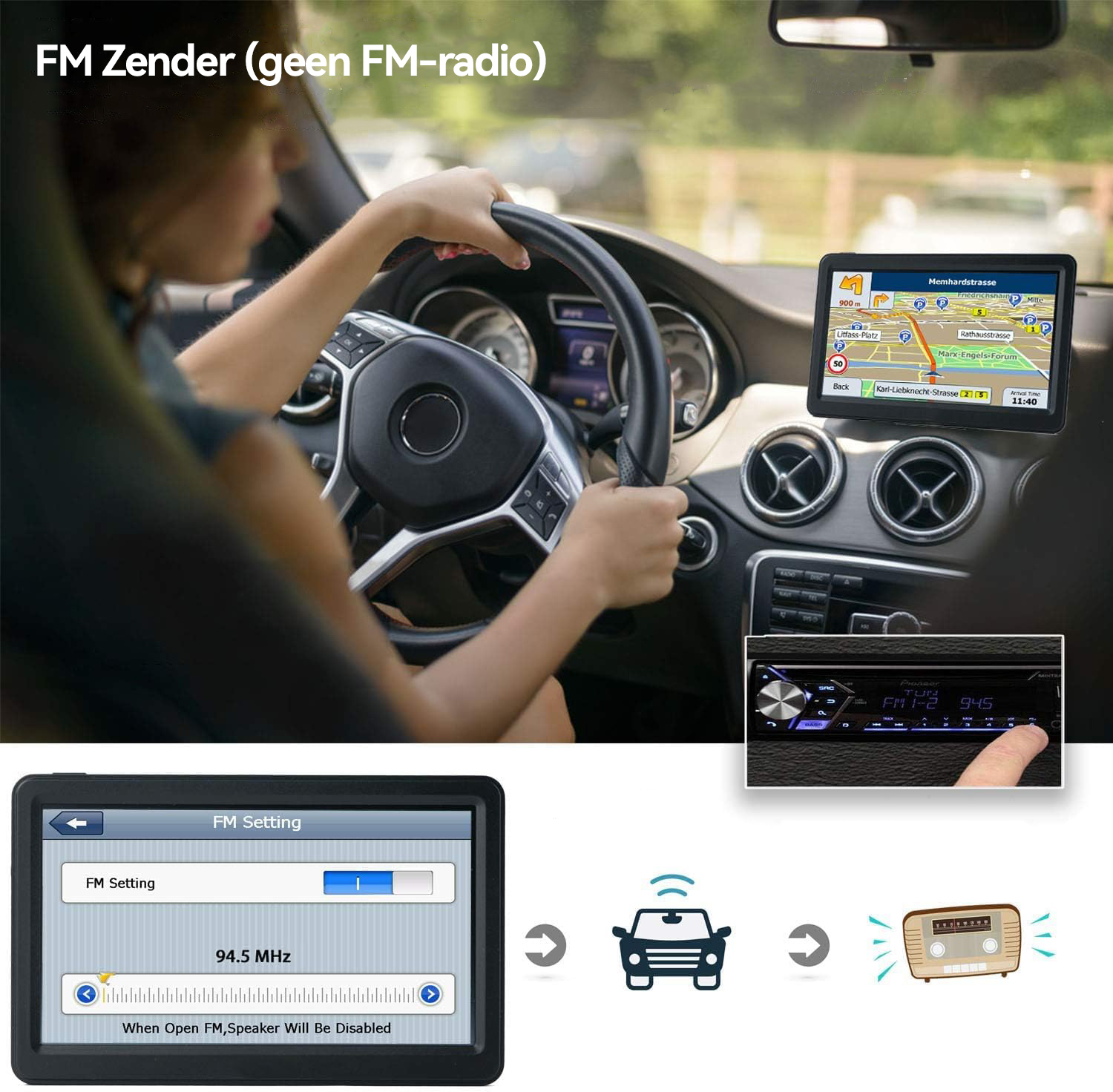 ☑️FM-zenderfunctie (Geen FM-radio) – Stuurt het navigatiegeluid naar de autoradio voor een luidere en duidelijkere weergave