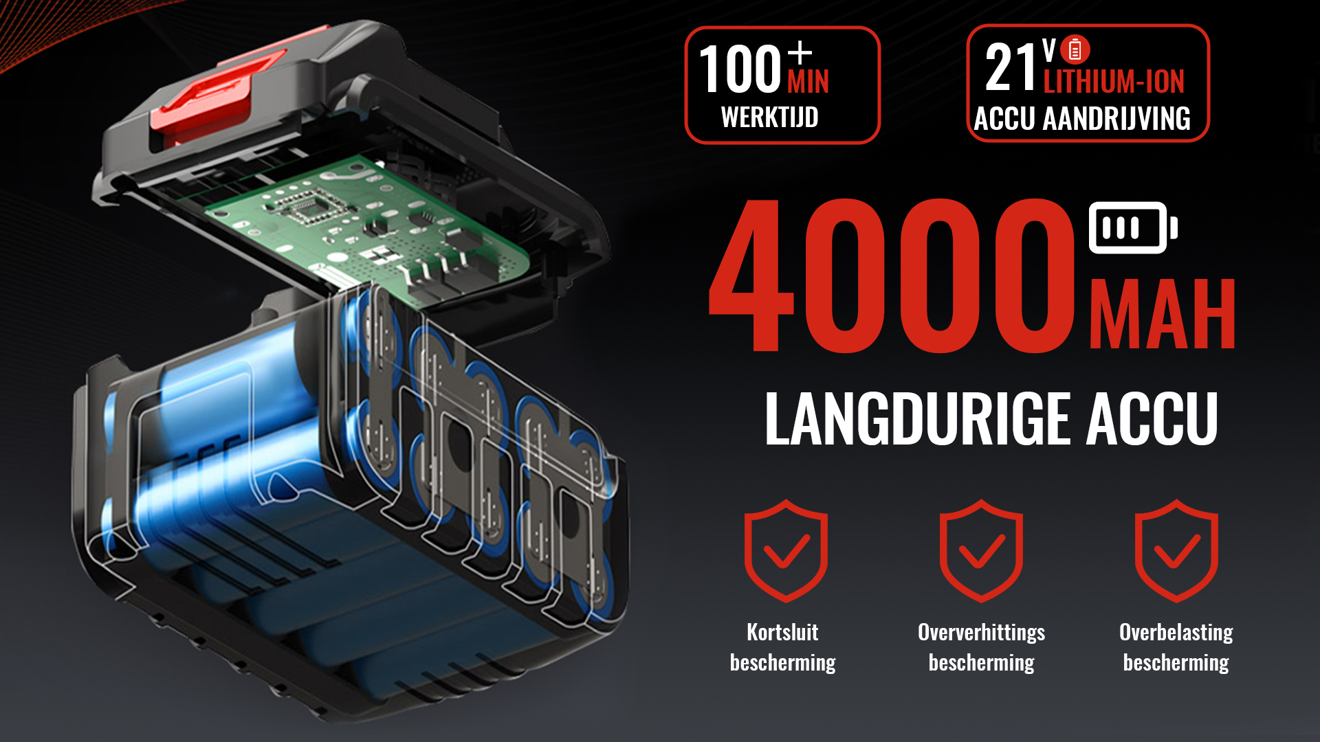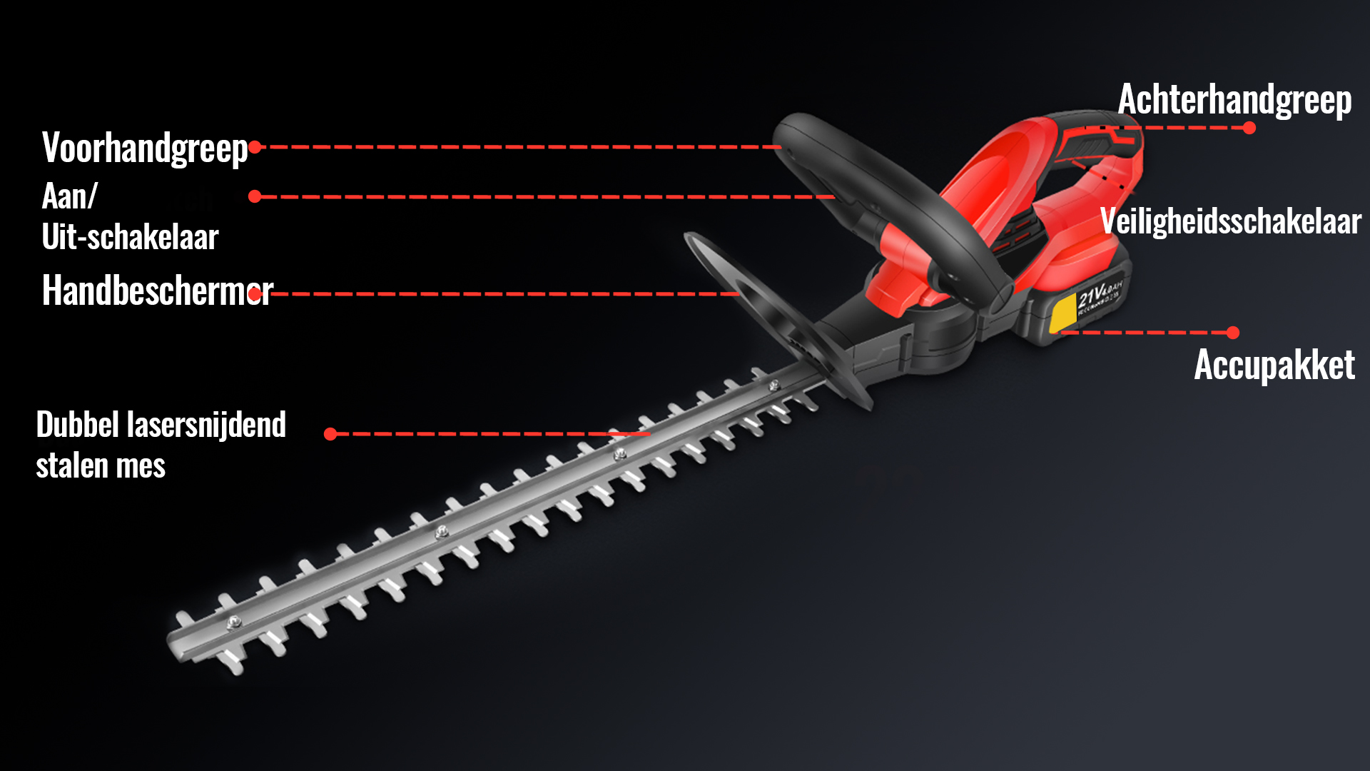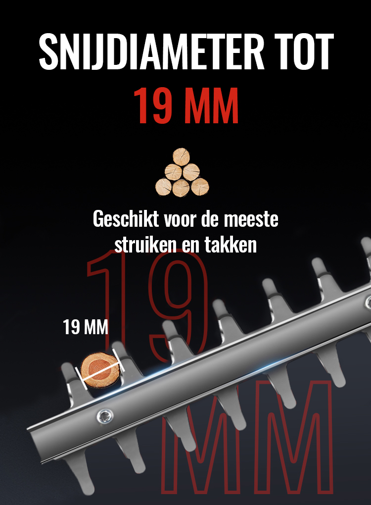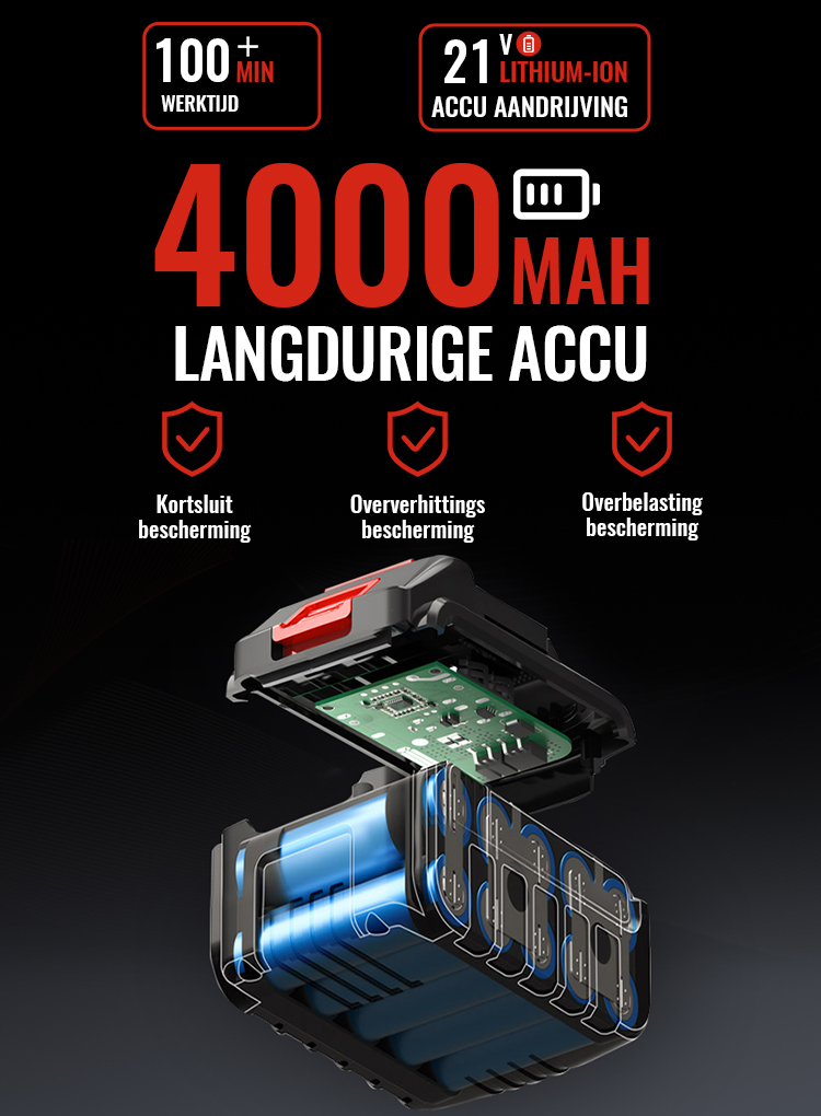 De elektrische heggenschaar is voorzien van een grote 21V 4000mAh lithium-ionaccu en een bijpassende oplader. De efficiënte accu kan na een volledige lading tot 100 minuten meedraaien, wat geschikt is voor de meeste snoeiwerkzaamheden. Een grotere accu om aan je energiebehoeften te voldoen.
