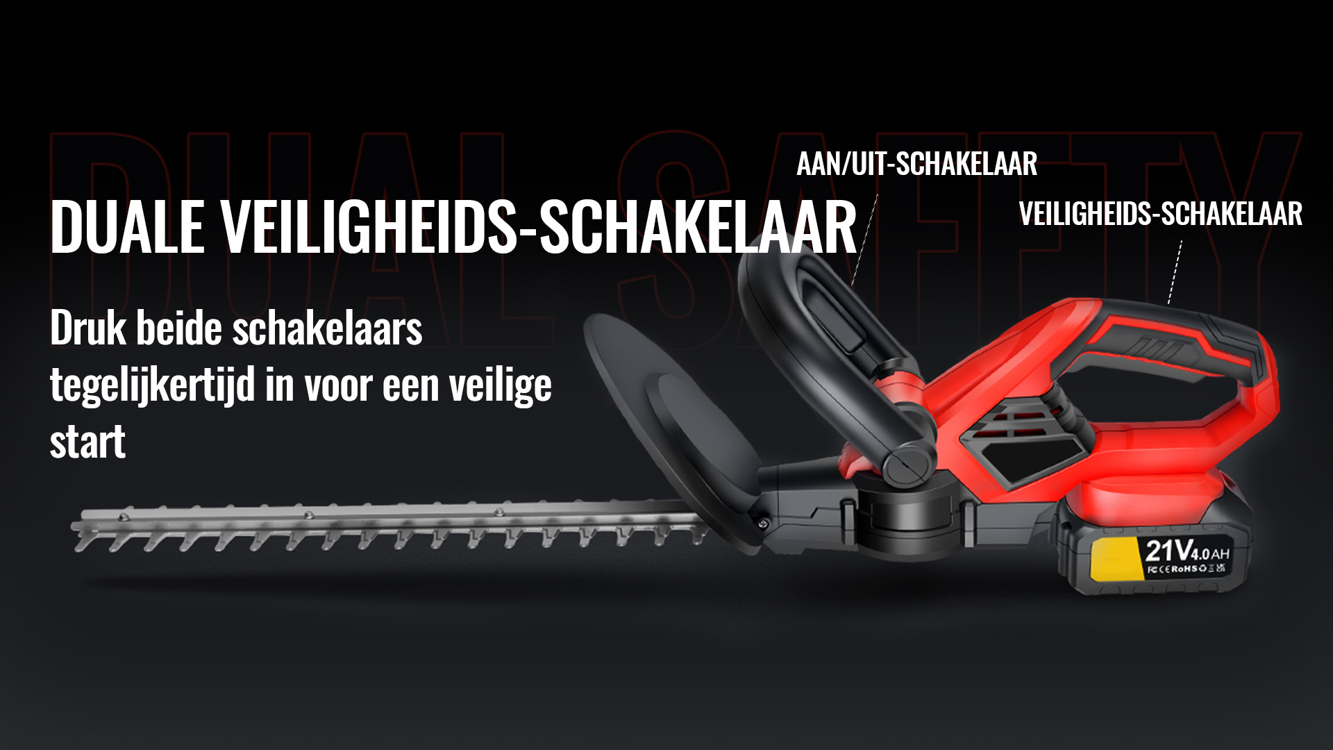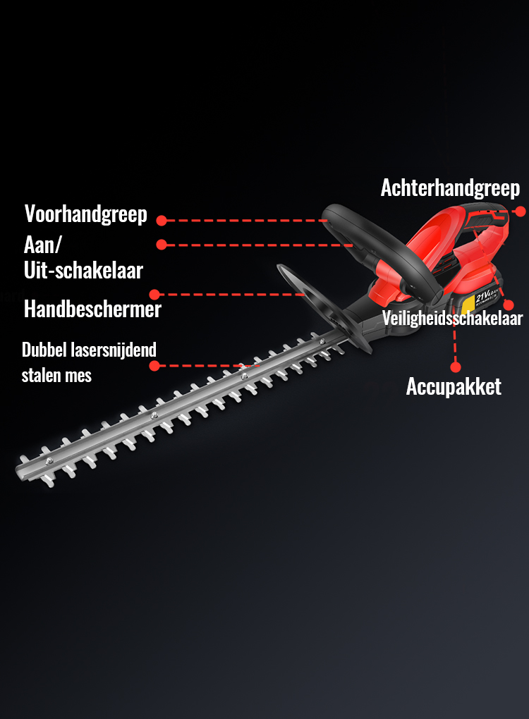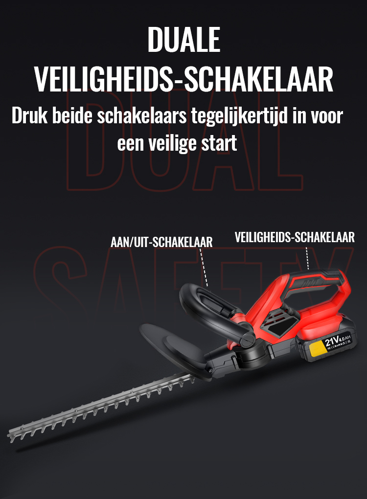 Uitgerust met een geïntegreerde handbeveiliging maakt de elektrische heggenschaar ook gebruik van een twee-fasen veiligheidstarttrigger systeem. De heggenschaar stopt ook onmiddellijk wanneer je de trigger loslaat, wat betekent dat als je het laat vallen, de machine onmiddellijk stopt.