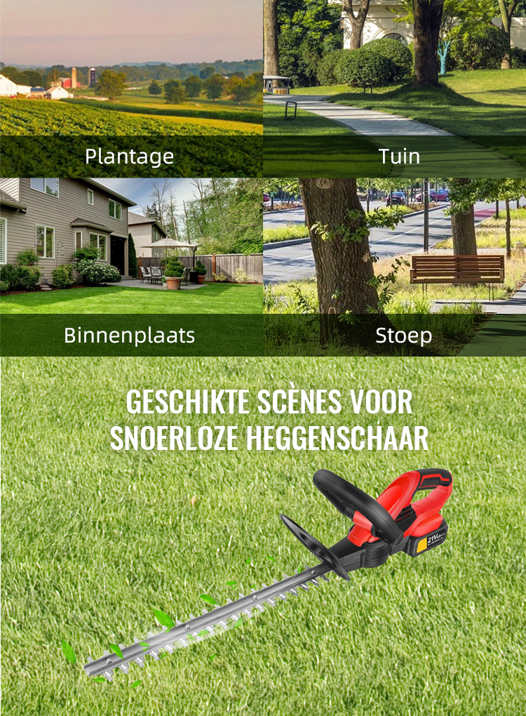 Deze heggenschaar heeft slechts 60 dB, wat aangeeft dat hij zeer stil is. Dit betekent dat het geluidsniveau tijdens het gebruik relatief laag is, waardoor het geschikt is voor gebruik in omgevingen waar geluid een zorg is, zoals woonwijken of rustige omgevingen. Het helpt ook om geluidsoverlast voor de omgeving en mensen te verminderen.