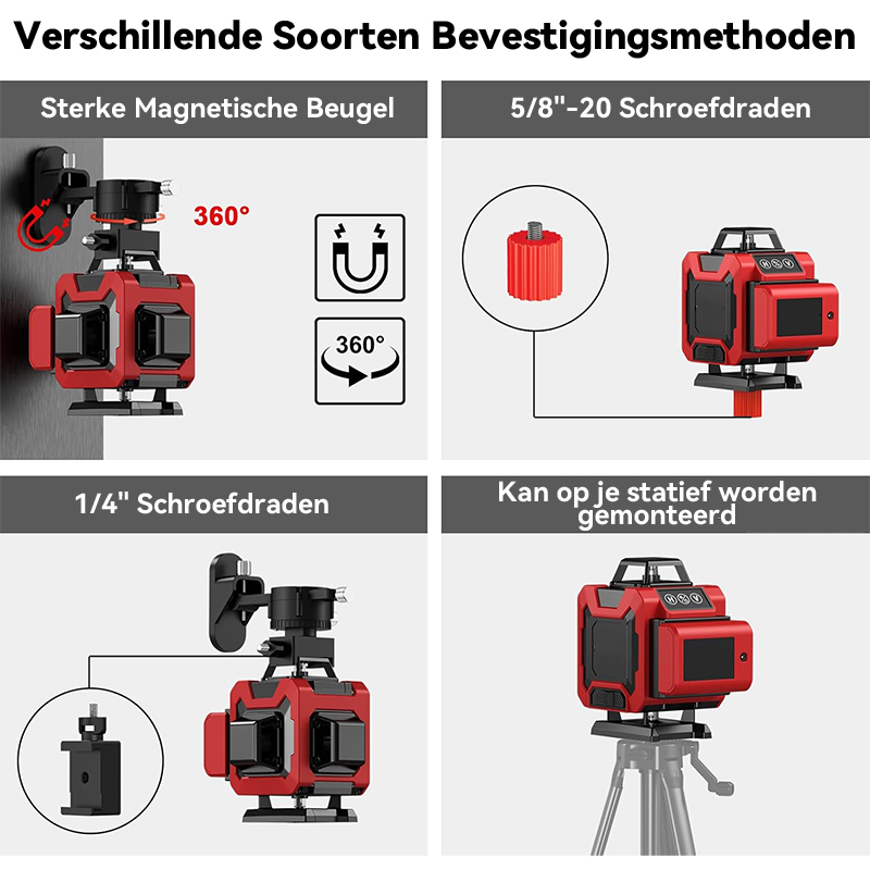Dit apparaat is compatibel met zowel 1/4" als 5/8" statieven. De verscheidenheid aan montagemogelijkheden maakt het een veelzijdig en eenvoudig te installeren hulpmiddel. Met zijn eenvoudige bediening neemt het apparaat het zware werk over, waarbij ervoor gezorgd wordt dat alles perfect is uitgelijnd zonder veel moeite van uw kant. De stevige montagebeugel verhoogt de veelzijdigheid, waardoor het eenvoudig aan verschillende oppervlakken kan worden bevestigd.